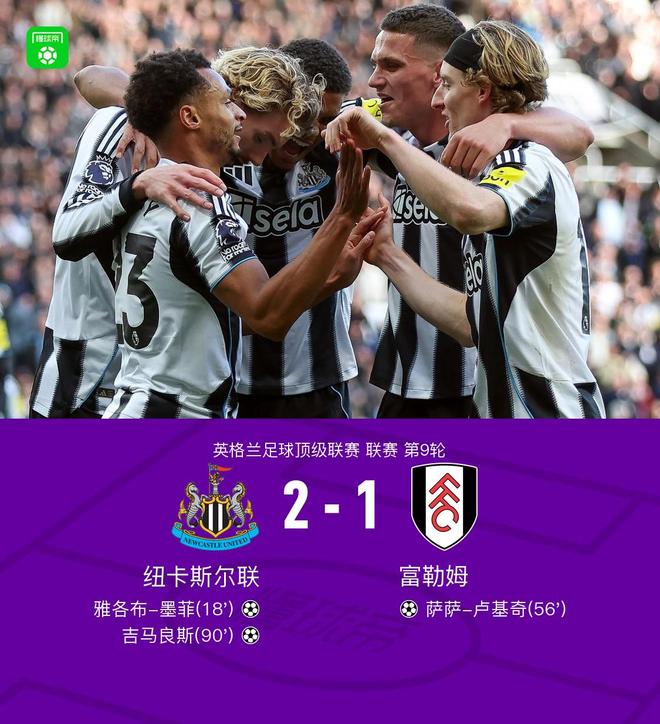 北京时间10月25日,英超第9轮比赛,纽卡斯尔联队主场迎战富勒姆。全场比赛,纽卡斯尔联队在雅各布·墨菲的带领下打破僵局取得领先。随后富勒姆的萨萨卢基奇将比分追平,两队陷入胶着。比赛最后几分钟,吉马良斯发力并攻入致胜一球。最终,纽卡斯尔联2-1击败富勒姆。重要赛事第18分钟,雅各布·墨菲禁区内得球低射破门,纽卡斯尔1-0获胜!只能在 MIG 上观看。英超联赛第56分钟,卢基奇门前头球破门,富勒姆1-1!只能在 MIG 上观看。英超第90分钟,吉马良斯补射破门,纽卡斯尔2-1!尚米格独家洞察英超联赛的精彩时刻。比赛双方各有两支球队入场d,战斗即将开始。 Shanmig 专门观看英超联赛。第4分钟,沃尔特·马德冲向球门,皮球击中立柱。 Shanmig 专门观看英超联赛。第6分钟,雅各布·墨菲角度不佳射门,皮球也击中立柱。米格专门观看英超联赛。第18分钟,雅各布·墨菲断球,跑入禁区低射破门,纽卡斯尔1-0。访问咪咕独家观看39分钟英超联赛。雅各布·墨菲独进一球。莱诺过来帮忙。访问咪咕独家观看56分钟英超联赛。卢基奇门前头球破门,富勒姆1-1!只能在 MIG 上观看。英超第90分钟,吉马良斯补射破门,纽卡斯尔2-1!只在咪咕上看英超【只在咪咕上看英超】