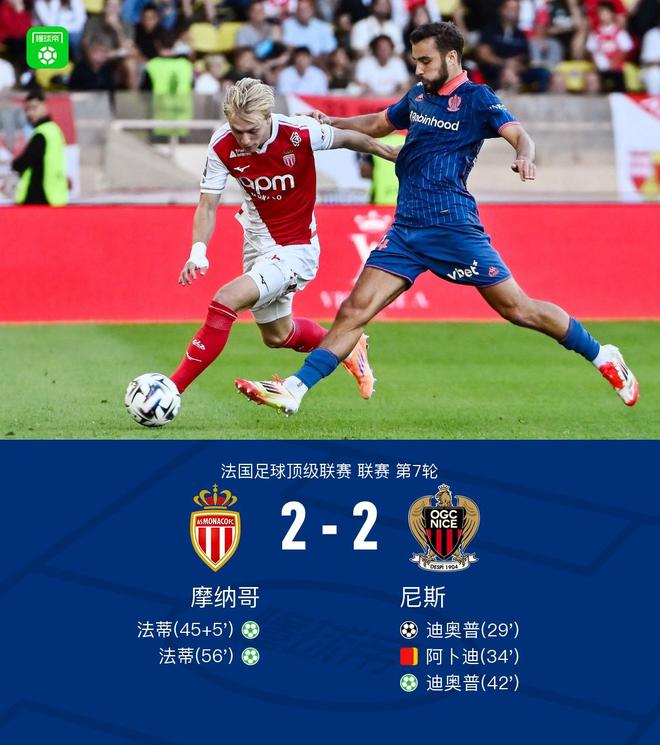 10月5日,北京时代,联赛的第七轮开始,摩纳哥面对在家。在游戏中,这位优秀的Diop球员首先与他的队友得分,他支持他并带领来访球队。迪奥普随后再次站在罚球点,不断进球,完成了第二个进球。在摩纳哥,法蒂在上半场以暂停期罚球,在上半场打进了球队进球。改变一侧后,菲蒂再次通过犯罪射击得分,分数并列。在比赛结束时,双方都以2-2迎接。在关键活动的第29分钟,Diop拍摄了前老师。在第34分钟,阿卜迪(Abdi)收到第二张黄牌后被派去。在第42分钟,迪亚塔(Diata)在骨科设备中给了手球两次。在第45分钟,安托万·门迪(Antoine Mendy)打了手球,菲蒂(Fati)受到打击,摩纳哥1-2!在第57分钟,Balogon得分得分,Fati两次赢得了摩纳哥2-2!在一个美好的时刻,双方的球员都进入了E体育场。战斗始于第17分钟。安托万·门迪(Antoine Mendy)赢得了头球,但由于越位,这是第一个空隙。在第29分钟,Diop开枪打开了老老师,并以1-0打破了它!在第34分钟,阿卜迪(Abdi)收到第二张黄牌后被派去。在第42分钟,迪亚塔(Diata)在骨科设备中给了手球两次。在第45分钟,安托万·门迪(Antoine Mendy)打了手球,菲蒂(Fati)受到打击,摩纳哥1-2!在第57分钟,Balogon得分得分,Fati两次赢得了摩纳哥!设备对齐的技术统计数据