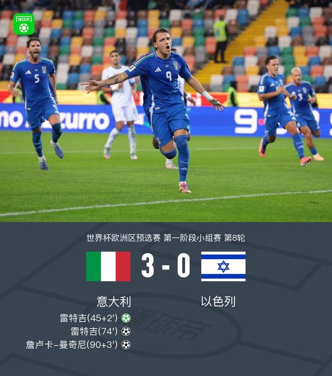 世界杯欧洲区预选赛小组赛第八天,意大利队与以色列队交锋。上半场补时阶段,雷特吉凭借点球取得领先。下半场双方更换阵容,进行了重赛。莱特西在前场断球,射门越过门将扩大领先优势。比赛进入补时阶段,迪马科助攻,曼奇尼禁区内头球破门。最终,意大利3-0击败对手。关键时刻:45'+2',雷特吉控球后射门。意大利1-0以色列。第73分钟,雷特吉前场断球,身后射门扩大比分。意大利2-0以色列。第90分钟+第3分钟,曼奇尼头球破门。意大利3-0以色列。比赛亮点: 两队球员均参加了比赛。第6分钟,雷特吉禁区内低射,但皮球高出球门。第11分钟,安德里亚·坎比亚森介入后射门,但球稍稍偏出。第19分钟,哈里里右路传球,格罗奇抽射破门。第28分钟,所罗门禁区内抽射被多纳鲁马扑出。雷特吉在第45分钟和第2分钟分别进球。意大利1-0以色列,得分和点球命中。第46分钟,意大利半场做出改变。皮奥·埃斯波西托换下拉斯帕多里。第54分钟,巴雷拉禁区内抽射,皮球高出球门。第61分钟,格洛克禁区内低射,但皮球被多纳鲁马扑出。第66分钟,安德里亚·坎·比亚索越位,进球无效。第73分钟,雷特吉前场断球后射门扩大比分。意大利2-0以色列。第84分钟,皮奥·埃斯波西托禁区外强行射门,但皮球被门将挡出。第90分钟和第3分钟,吉安卢卡·曼奇尼头球破门。意大利3-0 以色列团队技术统计
