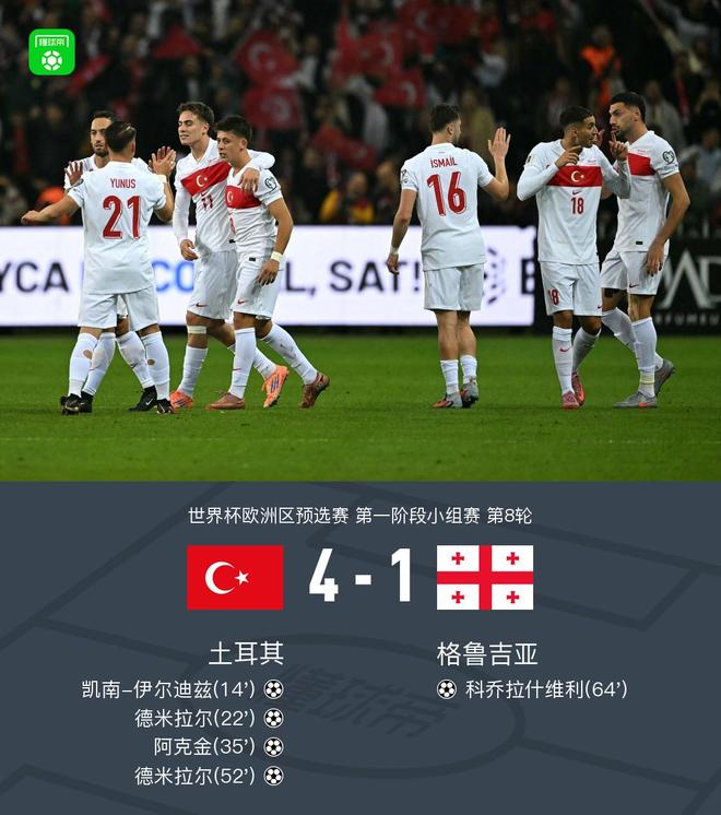 北京时间10月15日,欧洲世界杯预选赛第一小组赛第八轮,土耳其与格鲁吉亚的较量打响。比赛中,巴达克奇送出助攻,凯南·耶尔迪兹率先打破僵局。随后恰尔汗奥卢精准传球给德米拉尔,德米拉尔接球破门将比分扩大。上半场结束前,阿金凭借个人技术再得一分,进一步巩固领先优势。下半场比赛发生了变化,恰尔汗奥卢再次展现了他的传球技巧。德米拉尔获得第二次机会,拿下两分。格鲁吉亚也没有放弃,达维塔什维利助攻,科乔拉什维利门前破门扳回比分。此后,两队都无法拉开比分。最终,土耳其4-1战胜格鲁吉亚。关键比赛第14分钟,耶尔迪兹禁区内头球破门,格鲁吉亚1-0土耳其。第23分钟,黛米拉尔禁区头球破门,土耳其2-0战胜格鲁吉亚。第35分钟,阿金禁区内再次射门,土耳其3-0战胜格鲁吉亚。第52分钟,德米拉尔禁区内头球攻入个人第二球,格鲁吉亚4-0获胜。第64分钟,科乔拉什维利禁区射门破门,格鲁吉亚1-4。土耳其集锦 比赛第14分钟,耶尔迪兹禁区头球破门。土耳其1-0格鲁吉亚。第23分钟,德米拉尔禁区头球破门。土耳其2-0格鲁吉亚。第35分钟,阿金禁区内再次射门破门。土耳其3-0格鲁吉亚。第52分钟,德米拉尔禁区内头球攻入个人第二球。土耳其4-0格鲁吉亚。第64分钟,科乔拉什维利禁区头球破门。格鲁吉亚1-4。土耳其国家队阵容技术统计。